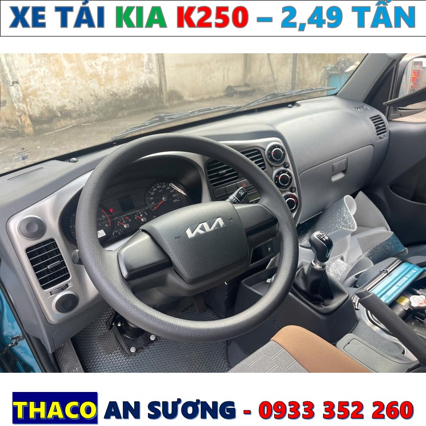 Xe tải kia K250 2,5 tấn thùng kín được thiết kế hoàn toàn mới, khoa học và ấn tượng. Gam màu xe tươi và không gian bên trong cabin rộng rãi, thoáng khí. Ghế ngồi cho 03 người có dây thắt an toàn, được bọc nỉ cao cấp giúp chống ẩm, thoáng khí và êm ái khi ngồi cả chặng đường dài. Kính chỉnh điện cùng cửa khóa trung tâm an toàn. Nội thất hiện đại và tiện nghi.