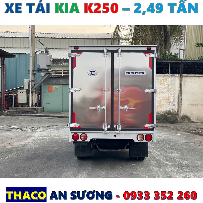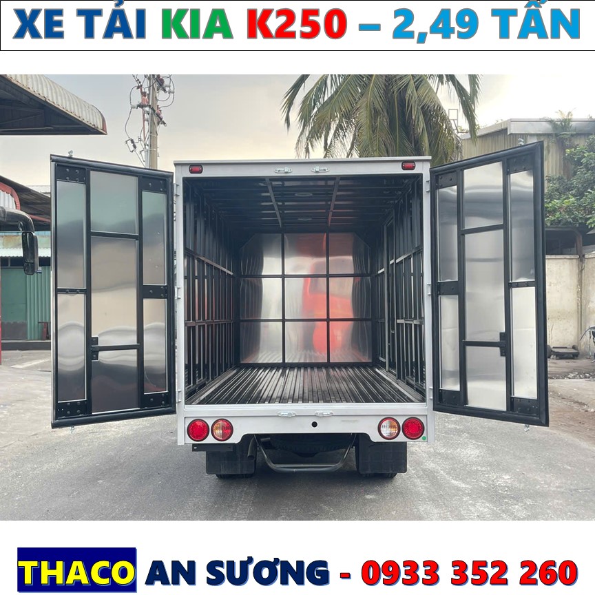 Xe tải kia K250 2,5 tấn thùng kín có tải trọng là 2.49 tấn được thiết kế với hệ thống phanh an toàn tuyệt đối, hệ thống phanh ABS giúp điều hòa, chống bó cứng lực phanh, hạn chế phanh gấp, xẹt bánh…trong những tình huống gặp phải khúc cua hay phanh xe tức thì.Hệ thống cân bằng điện tử ESC ở phanh xe giúp xe đạt được sự ổn định, tránh bị mất lái, văng đuôi xe hay những tình huống lật xe khi thắng gấp, khúc cua... được bán chạy nhất là mẫu thùng dạng đóng từ thùng lửng lên thùng mui bạt, dạng mở 3 bửng. Với mẫu thùng này sẽ giúp chiếc xe cứng cáp hơn, bảo vệ hàng hóa khỏi gió mưa tốt hơn vì các vách được gia cố bằng các tấm tôn kim loại.