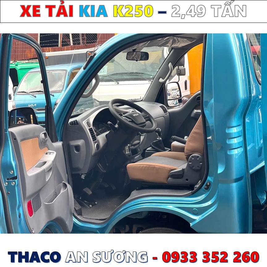 Xe tải kia K250 2,5 tấn thùng lửng được thiết kế hoàn toàn mới, khoa học và ấn tượng. Gam màu xe tươi và không gian bên trong cabin rộng rãi, thoáng khí. Ghế ngồi cho 03 người có dây thắt an toàn, được bọc nỉ cao cấp giúp chống ẩm, thoáng khí và êm ái khi ngồi cả chặng đường dài. Kính chỉnh điện cùng cửa khóa trung tâm an toàn. Nội thất hiện đại và tiện nghi.
