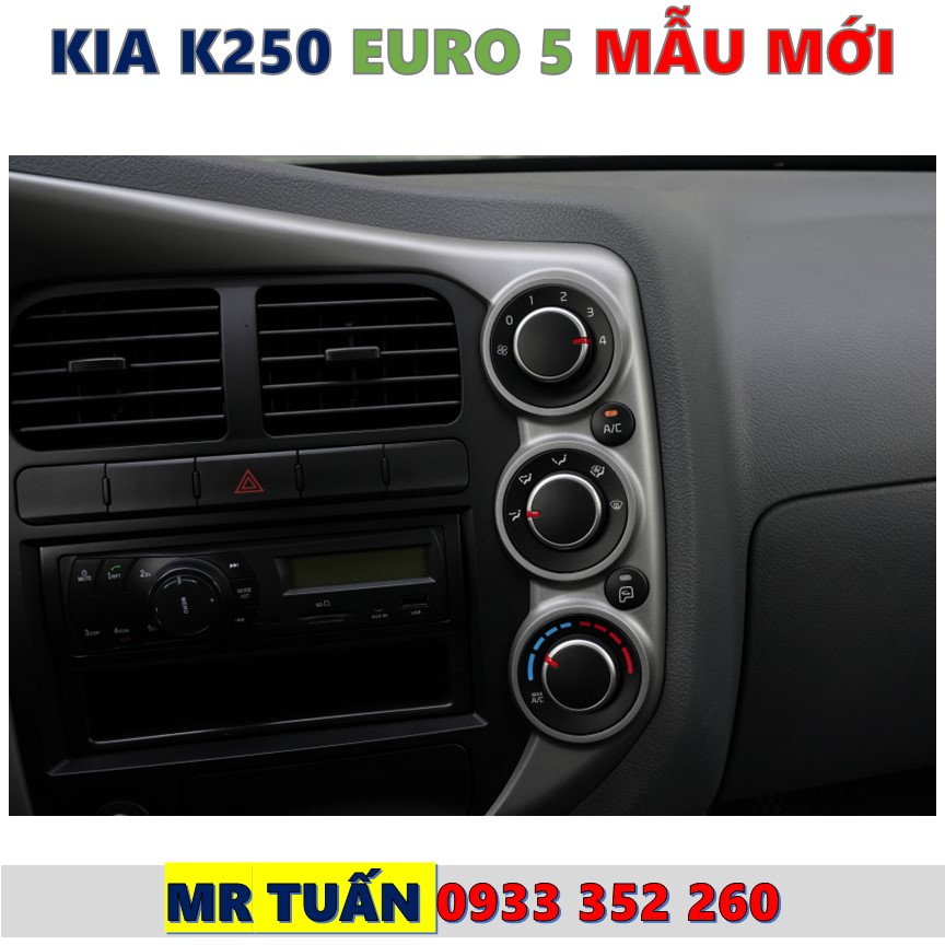 Xe tải Kia K250 euro 5 mới nhất Điều chỉnh tùy theo tư thế người lái. Vô lăng gật gù điều chỉnh thích hợp với từng dáng người. Bảng điều khiển trung tâm tích hợp đầy đủ các nút chỉnh điều hòa, quạt gió cabin, , USB, cổng AUX, và hệ thống âm thanh radio thuận tiện với tầm tay phục vụ cho việc giải trí, nghe nhạc, đài FM. Cần gài số sàn; 6 số tiến 1 số lùi thiết kế hợp lý, thuận tiện như xe du lịch