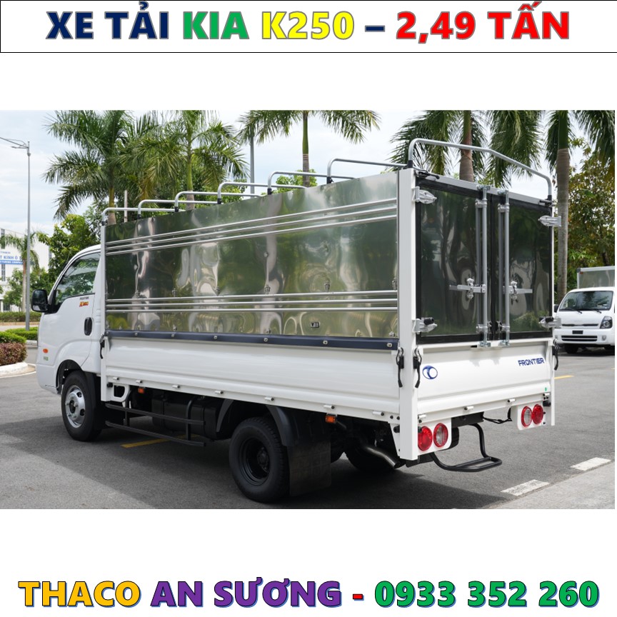 Xe Tải Kia K250 mui bạt 3 bửng tải trọng 2,49 tấn, được trang bị động cơ Hyundai D4CB tiêu chuẩn khí thải Euro 4, vận hành mạnh mẽ, thân thiện với môi trường. Cabin kiểu mới, thiết kế hiện đại được sơn nhúng tĩnh điện nguyên khối và sơn màu với công nghệ Metalic. Hộp số gồm 06 số tiến + 01 số lùi, có 2 tỉ số truyền nhanh giúp xe vận hành mạnh mẽ và linh hoạt.